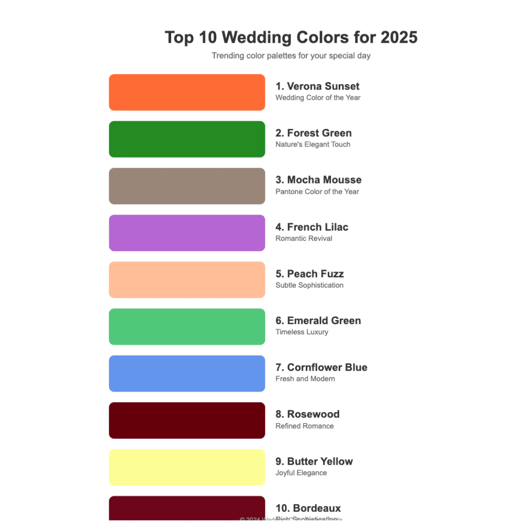 As we embrace the wedding trends of 2025, it’s clear that color choices are becoming more personal and expressive than ever before. Whether you’re drawn to the warmth of Verona Sunset, the sophistication of Mocha Mousse, or the timeless appeal of Forest Green, the key is to select colors that truly reflect your personality and vision for your special day. Remember that while trends provide wonderful inspiration, the most successful wedding colors are those that make you feel confident and celebrated. As you plan your 2025 wedding, consider how these trending palettes might be customized to create your own unique celebration, one that will be remembered for years to come.
