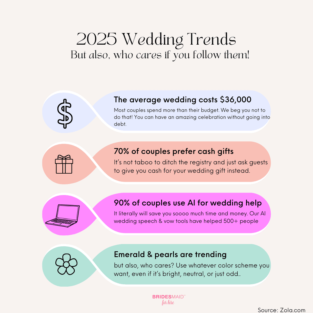 Hi, Friend! Jen Glantz here. I’m a bestselling author and the first ever bridesmaid for hire. I’m excited for 2025 because there are so many new and exciting wedding trends. From bright colors to unique dress styles, we’re seeing more personalization and minimization this year. Welcome to a guide on 2025 wedding trends. Let’s dive in!