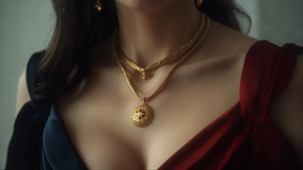 Seasonal lighting conditions affect how gold appears—summer’s natural light enhances gold’s brilliance while winter’s indoor lighting brings out its warmth. This lighting difference is why the same gold necklace might look completely different paired with a summer dress outdoors versus a winter dress at an evening event.