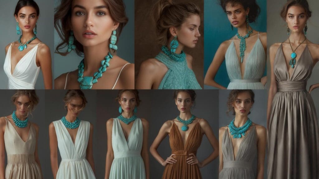 Skin undertone significantly impacts how both the jewelry and dress appear. If you have warm undertones (yellow/golden), you’ll often look best in earthy tones paired with turquoise. Those with cool undertones (pink/blue) typically shine in jewel tones or crisp neutrals when wearing these blue-green gems.