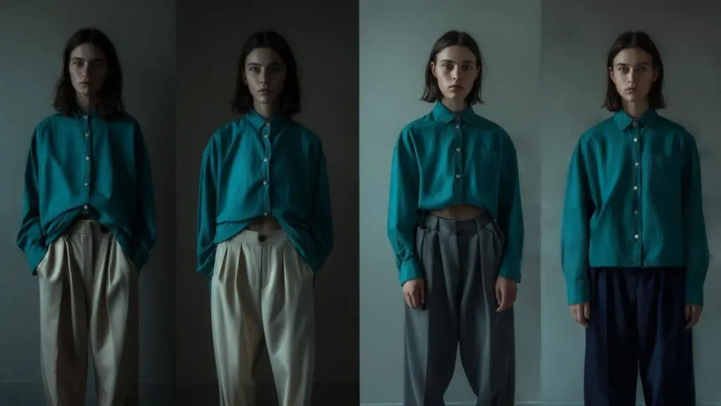 The undertone of your specific teal shade (whether it leans more blue or more green) will affect which pants colors create the most harmonious combinations. A blue-leaning teal might work better with warmer neutrals, while a green-leaning teal might pair more effectively with cooler tones.