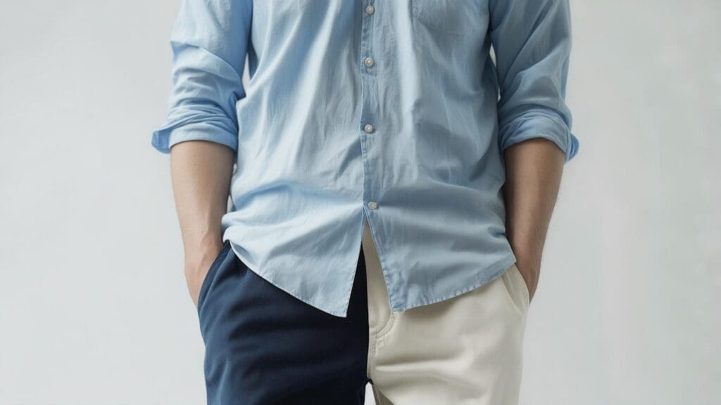 Shorter frames benefit from monochromatic or similar-toned combinations that create vertical lines. Athletic builds have flexibility across the spectrum, from slim-fit to relaxed styles. Larger frames often look best in pants with subtle texture and medium contrast with light blue shirts, avoiding extreme light or dark options.