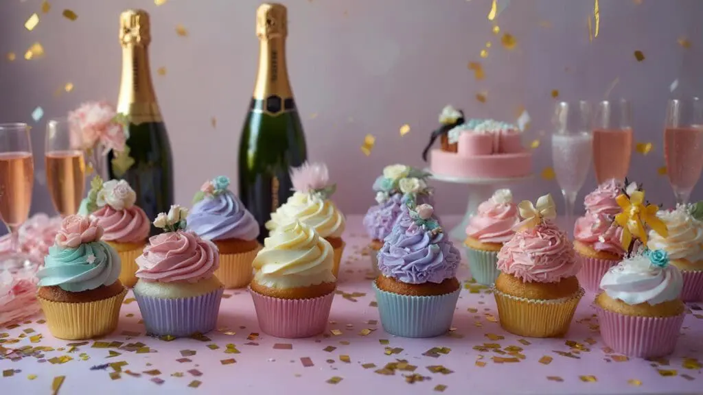 Lively party scene with cupcakes, champagne, and colorful confetti.