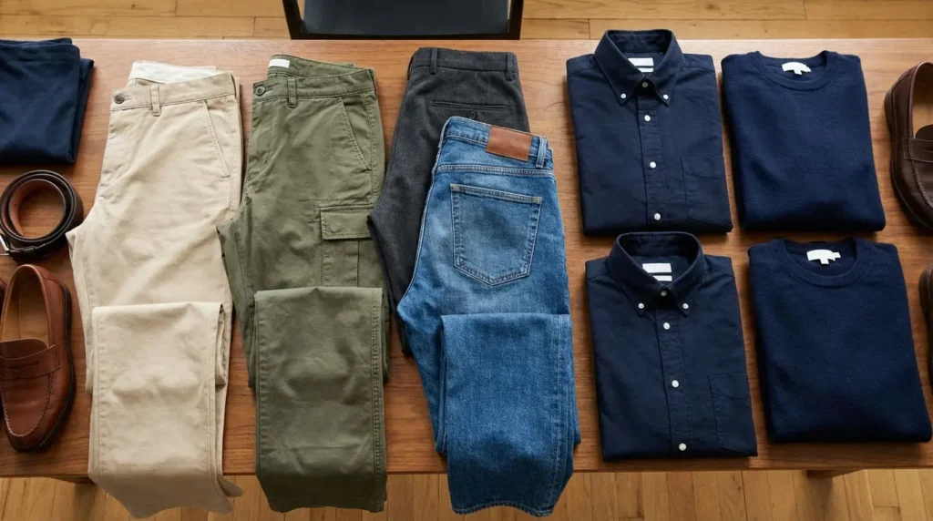 Before you grab the first pair of clean pants you see, take a second to think about where you’re actually going. A dark blue shirt is versatile, but the wrong pants can make the whole outfit fall flat.