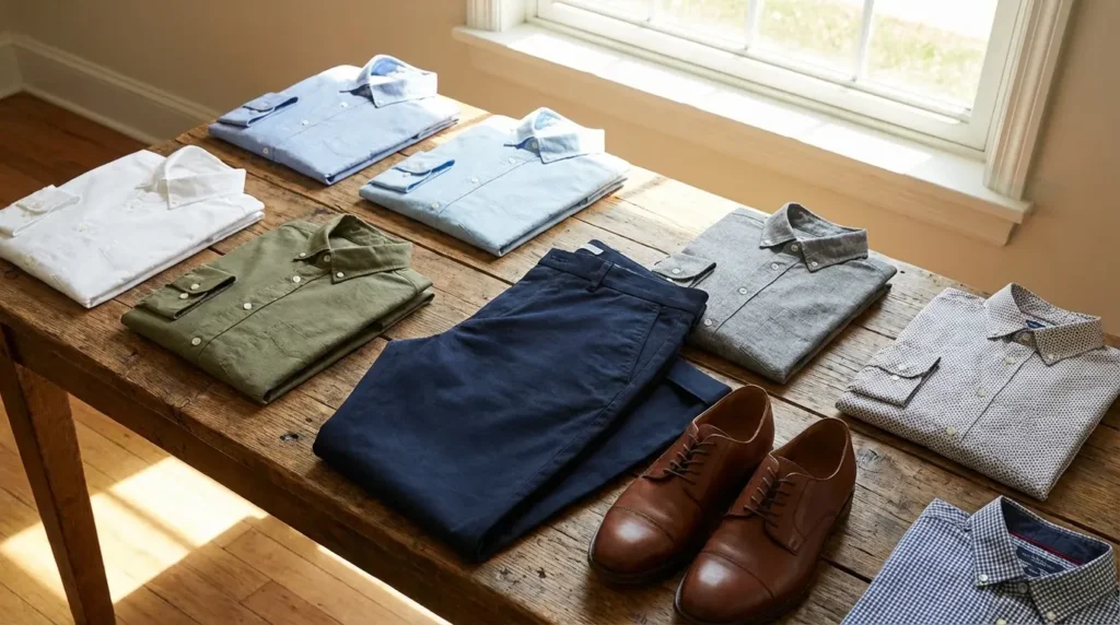 You have a busy Saturday that involves running errands, maybe a coffee date, and then a casual dinner with friends. A T-shirt feels too sloppy, but a dress shirt feels too stiff. Enter the Chambray shirt. Worn untucked with white sneakers, it handles the errands. Tucked in with boots, it handles the dinner. The texture of the denim makes the navy pants feel less like “work clothes” and more like “style choices.”