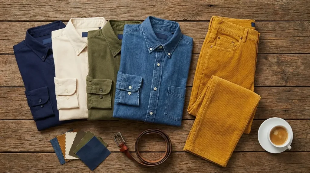 The “Pumpkin Patch” Date: If you are heading out for a quintessential fall date, pair mustard corduroys with a rust-colored flannel shirt. To break up the “wall of warm color,” wear a white t-shirt underneath and leave the flannel unbuttoned. It adds a neutral strip down the center that balances everything out.