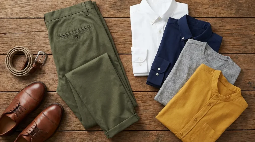 I actually picked up a pair of olive chinos recently after reading a great piece on Never Neud. But when I got to the fitting room, I froze. I was holding five different shirts and had no clue which one actually worked. I didn’t want to look like a park ranger or a Christmas elf; I just wanted to look sharp.