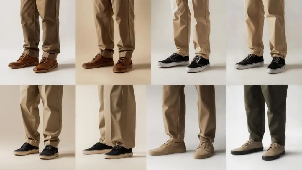 Weather plays a huge role too. I tend to wear lighter shoes with my khakis during summer months, while saving darker, more substantial footwear for winter. And don’t forget about the specific shade of your khakis! Light beige, medium tan, and darker olive each call for different shoe pairings.