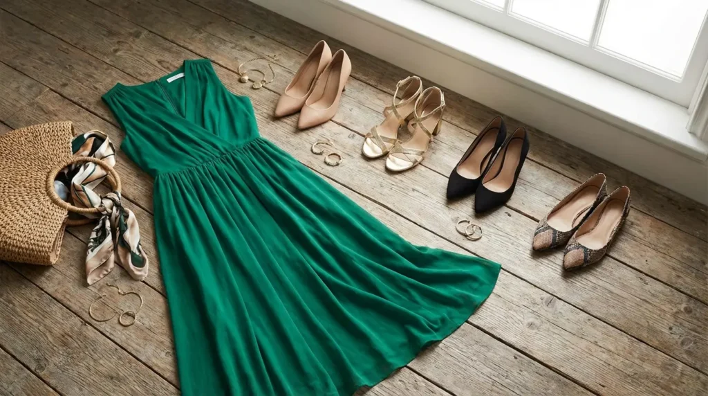 Next, think about the vibe. Sparkly metallics are for black-tie weddings; leather and cork are for garden parties. Finally, match the “weight” of the shoe to the dress. Heavy velvet needs a sturdy shoe, while light chiffon calls for something delicate. When you’re hunting for shoes to wear with a green dress, balance is everything.