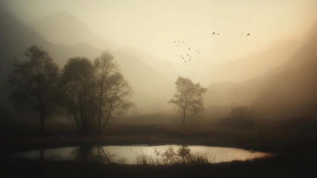 Movement and stillness combine as a falling leaf encounters its mirror image, creating both literal and symbolic reflection. The poem captures autumn’s essence while suggesting themes of self-recognition and the cyclical nature of existence. Dual meaning of “reflection” operates on physical and metaphorical levels, adding depth through wordplay that enhances rather than complicates meaning.