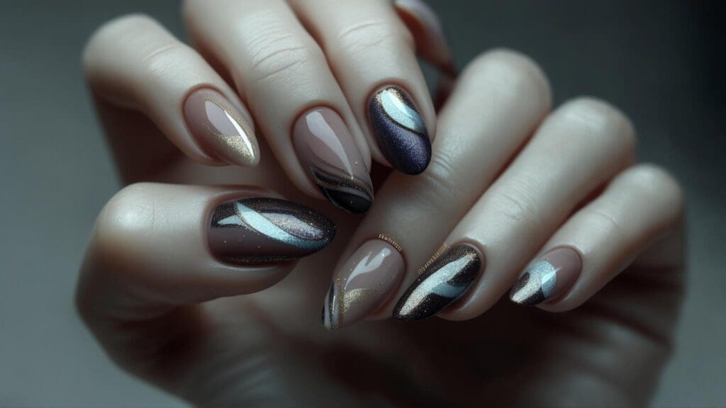 Four neutral nails provide a calm foundation while one statement nail features a single design element. A thin gold stripe or small crystal maximizes impact through strategic restraint.