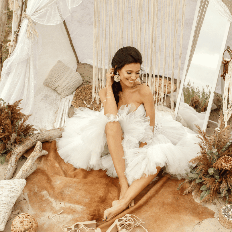 A lace-up corset dress combines romantic details with a touch of sensuality, perfect for brides who want to feel confident and alluring during their bachelorette party. The corset-style bodice provides structure and support, while the lace-up detail adds visual interest.