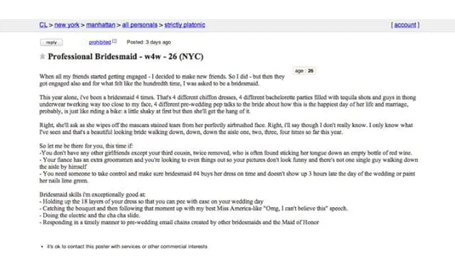 But two-years-ago, I didn’t have a clue what I was doing when I posted that Craigslist ad. I was sick of being the perpetual bridesmaid for my friends. My roommate, in passing, called me a professional bridesmaid. I had a bad Friday night. I came home and posted the ad and went to sleep. I didn’t tell anyone. I didn’t think I ever would.