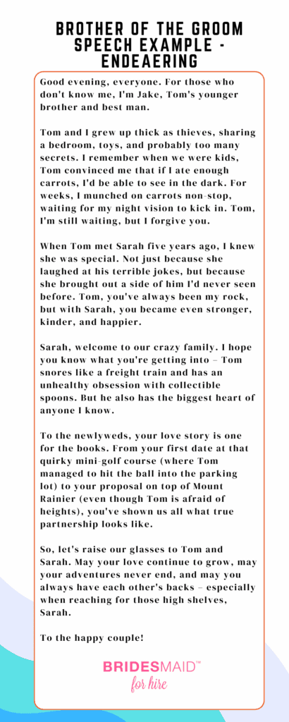 So here’s to you, brother of the groom. Here’s to love, to family, and to speeches that come from the heart. You’ve got this. Now go out there and make your brother proud.
