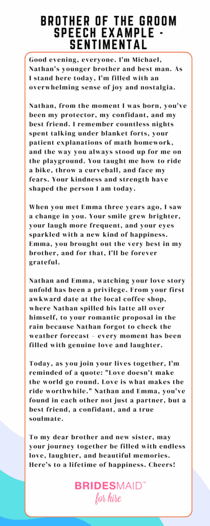 Start by acknowledging the significance of the day and how honored you are to be standing by your brother’s side. Share your hopes and dreams for their future together, and let them know how much their love and commitment mean to you. Speak from the heart, and don’t shy away from showing your emotions. A few heartfelt words can go a long way in making your speech memorable.