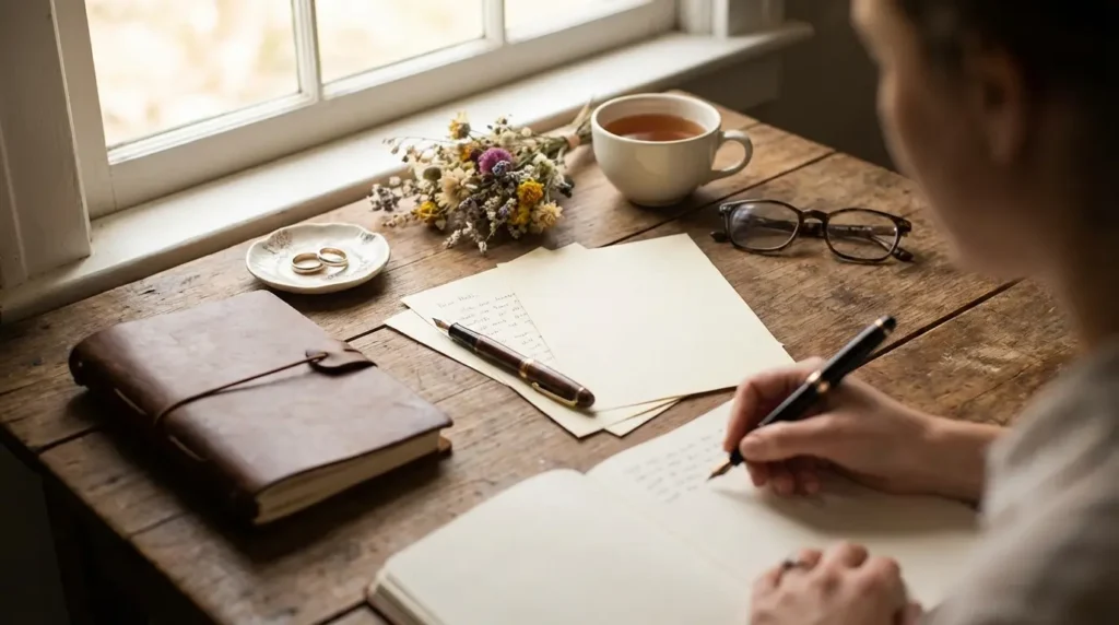 Rushing into writing without knowing what you’re doing is how you end up with a rambling speech instead of vows. Let’s ground this. Even if you scribble these words five minutes before walking down the aisle, they can still carry weight. It might help to quickly skim 6 things to know before you write your wedding vows just to get your head in the right space.