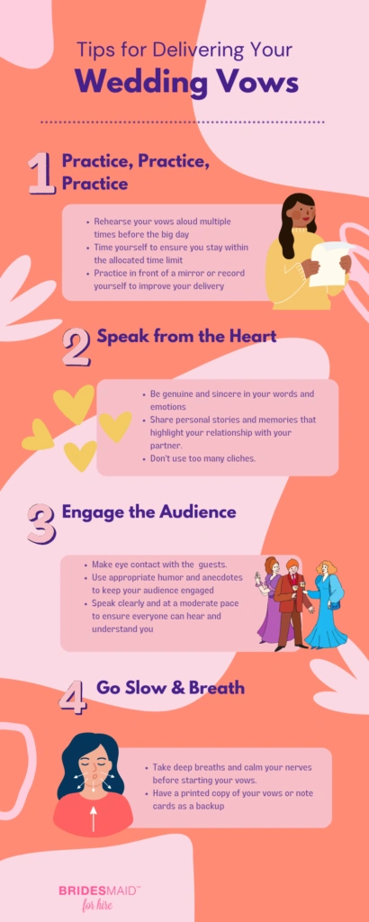 Alright, lovebirds, you’ve poured your heart and soul into writing those swoon-worthy wedding vows for him. But now comes the real test – delivering them in a way that will make your partner’s heart melt (and maybe even shed a happy tear or two).