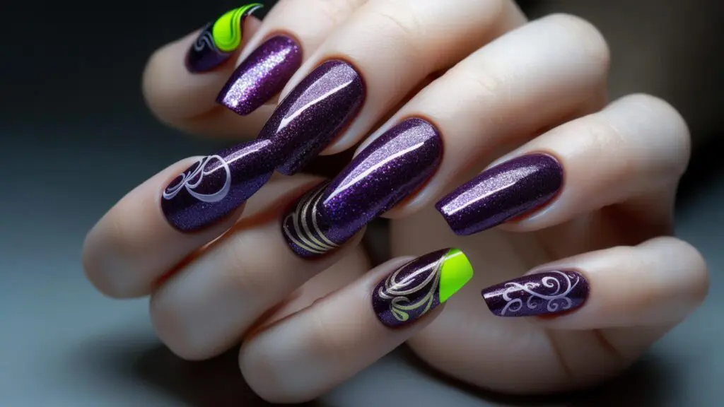 These create color-shifting effects that seem almost magical. The same nail appears purple from one angle, green from another, with gold highlights that emerge in certain lighting.