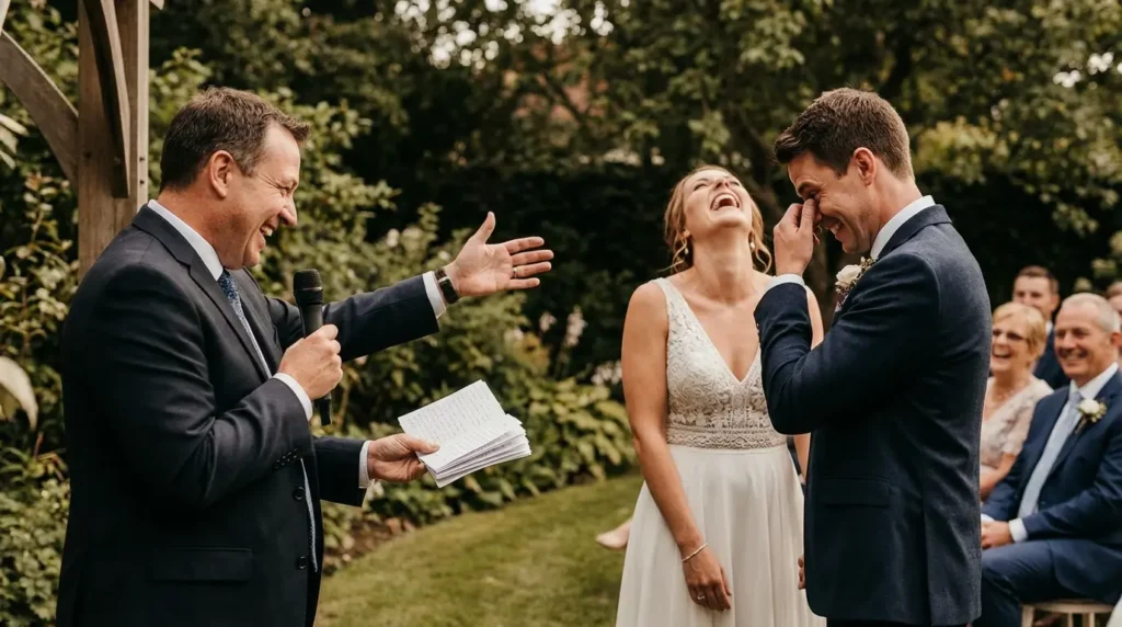 You aren’t there to perform a tight five; you are there to humanize a high-stakes moment. Weddings are tense! Laughter deflates that tension and actually makes the emotional parts hit harder. When you’re writing your script, remember: the goal is connection, not just “being funny.”