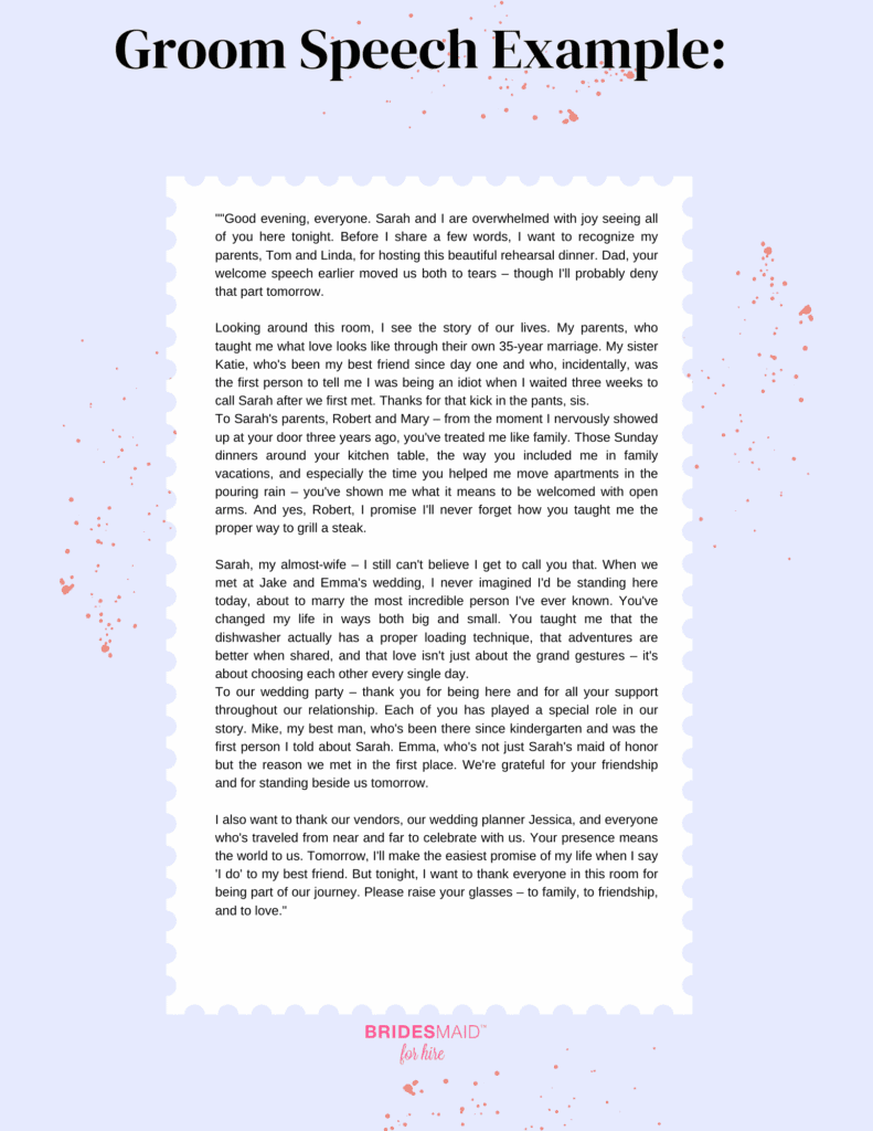 If you’re still feeling unsure, don’t hesitate to reach out for support. Bridesmaid For Hire specializes in helping grooms like you create speeches that truly capture the essence of your relationship. Our team can guide you through the process, from brainstorming ideas to perfecting your delivery.