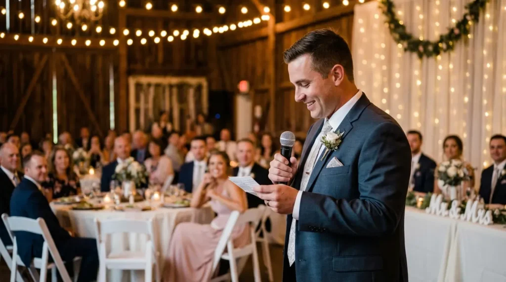 Traditionally, you carry the burden of the administrative “thank yous” to parents, vendors, and guests. The challenge is balancing these obligations without turning the speech into a boring list of names. If you’re struggling with who to acknowledge, we have a dedicated article on wedding thank you speeches that helps you prioritize gratitude without boring the crowd.