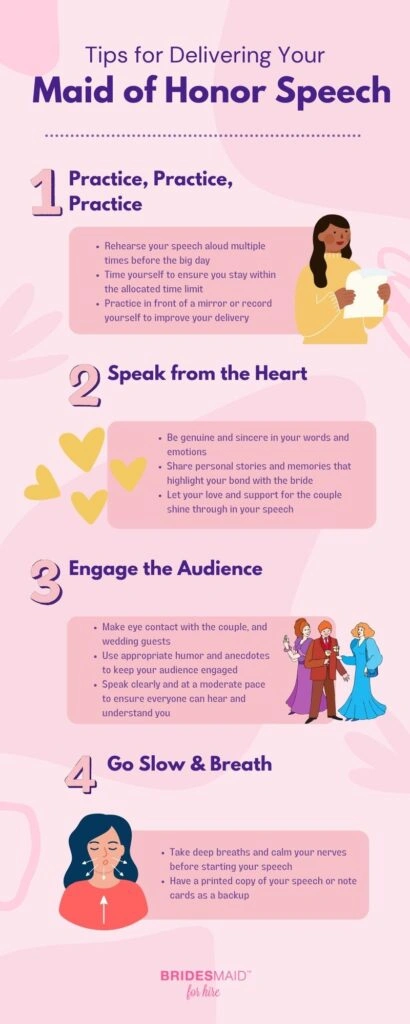 Finalizing your maid of honor speech is a process that requires time, effort, and dedication. By carefully editing and refining your words, practicing your delivery, and staying true to the heartfelt sentiments you wish to express, you’ll be able to create a speech that not only honors the newlyweds but also reflects the unique bond you share with the bride.