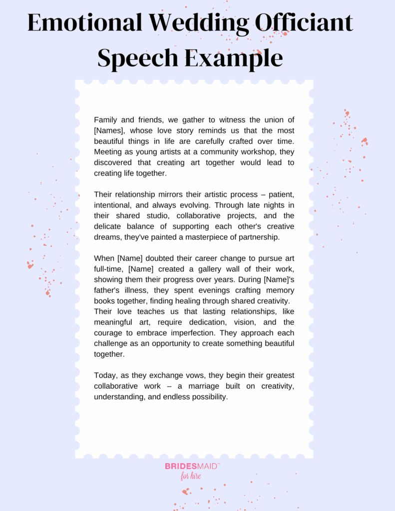 Crafting an emotional wedding officiant speech is both an art and a science. It requires a deep understanding of the couple, sensitivity to the audience, and the ability to weave together various elements into a cohesive and touching narrative.