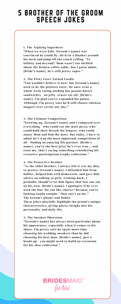 Gentle teasing about your brother’s peculiarities can be a great source of humor. Whether it’s his obsession with a particular hobby, his unique daily routines, or his quirky habits, these jokes can paint a vivid and entertaining picture of the groom’s personality.