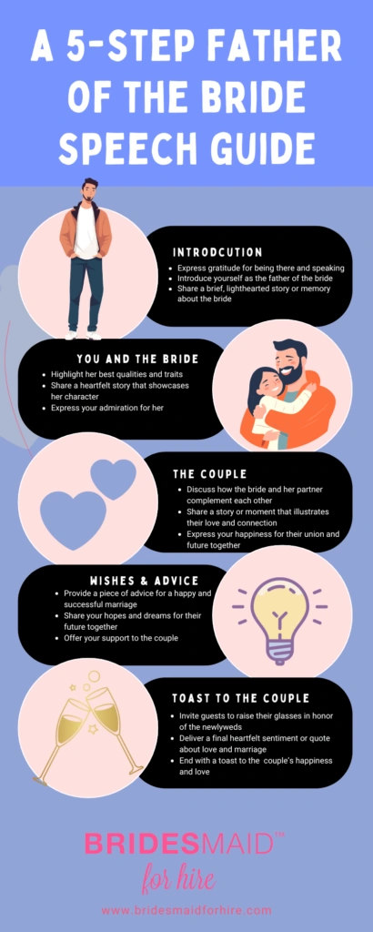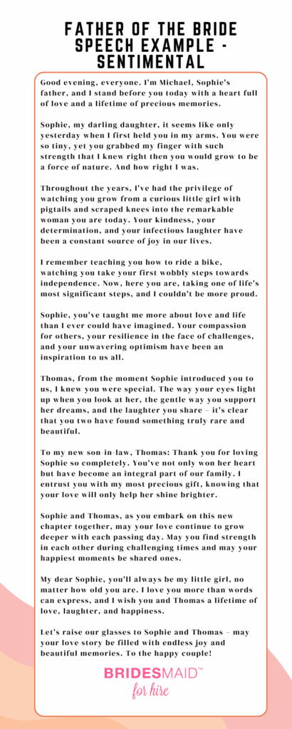 Crafting a funny and heartfelt father of the bride speech is a rewarding experience. By following the tips and insights provided in this guide, you can create a memorable speech that will be cherished by your daughter and all the wedding guests. And remember, if you need any help, Bridesmaid for Hire is here to support you every step of the way.