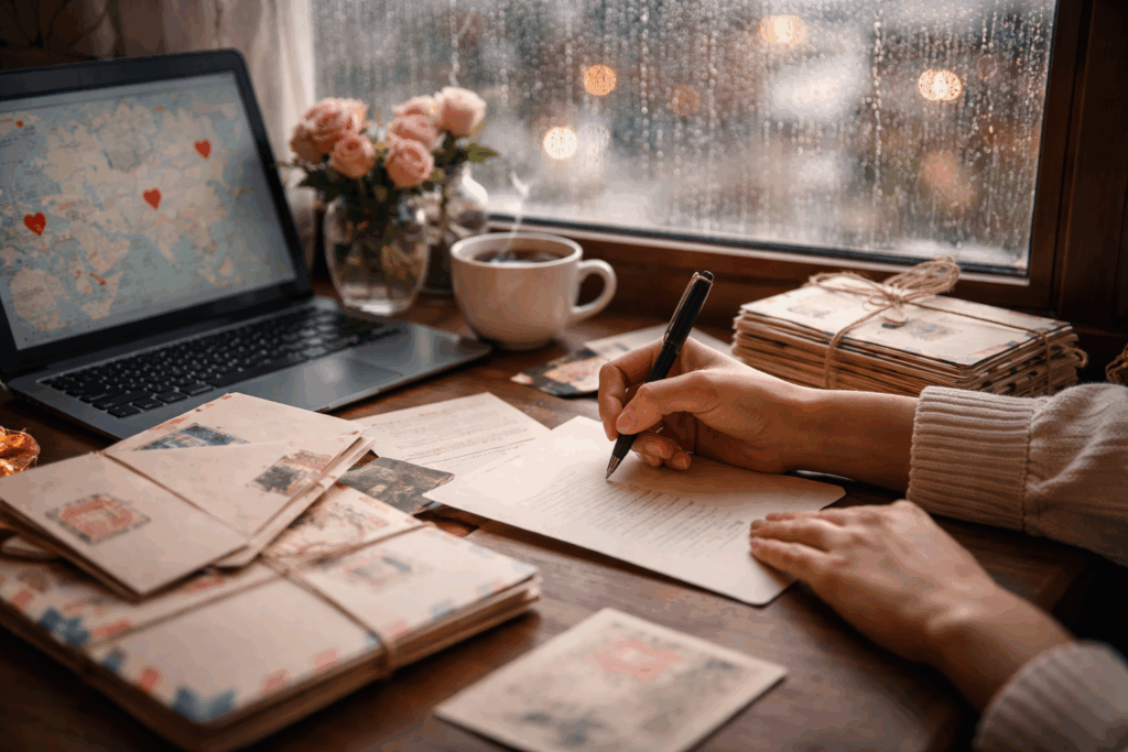Consistency beats intensity. You don’t need to write a novel every day, but a schedule helps. Maybe you agree to write once a week, or you pick a monthly theme (like “favorite childhood memories”) to keep things fresh. Another fun idea? Wait to open your letters until you’re on FaceTime together. Read them aloud or just watch each other read silently. It turns a solitary moment into a shared date night.