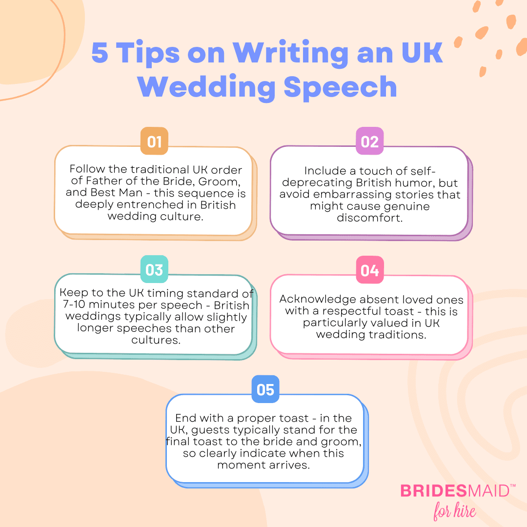 Each speaker in this traditional sequence serves a specific purpose. Together they create a meaningful narrative that celebrates the couple’s journey. This classic order continues to influence UK wedding speeches even as new variations emerge.