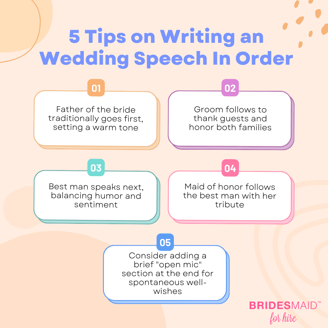 But before we dive into the exciting new trends, let’s take a moment to appreciate the foundation that’s paved the way for these changes. Understanding the traditional speech order gives us a solid starting point to explore how modern couples are making it their own.