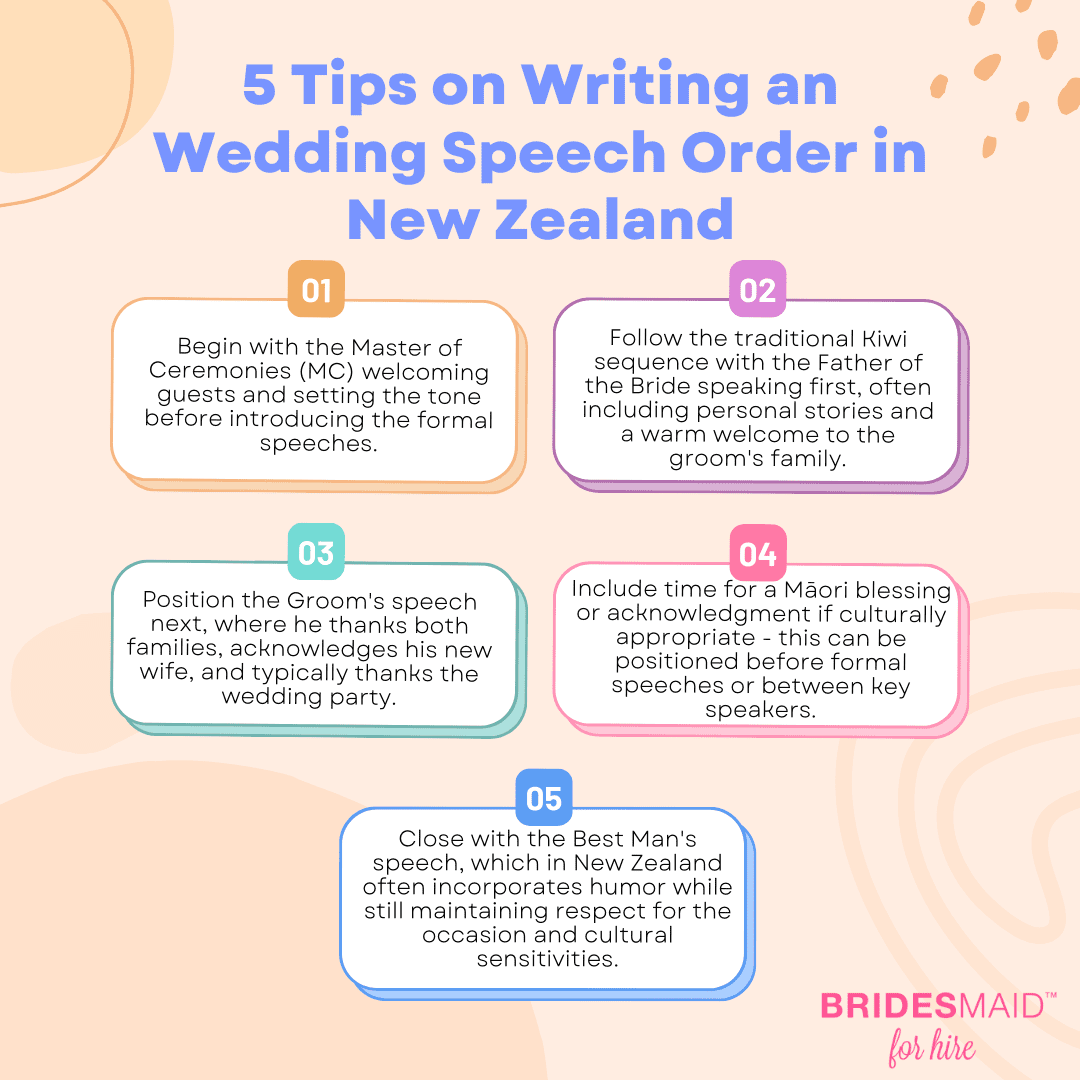 Preparing speakers well in advance removes much of the stress associated with Wedding Speech Order in New Zealand. Begin conversations about speeches at least two months before your celebration.