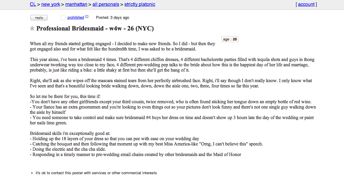 I’ve told this story before, but the truth is I posted the ad for one daringly simple reason: I had a really lousy Friday night. I found myself in front of a couple of women who made me feel worthless. Who made me feel like I was a complete and utter nobody. And maybe I truly was. But it didn’t really matter because I walked out of that meeting, at a coffee shop on 9th avenue, and walked all the way home.