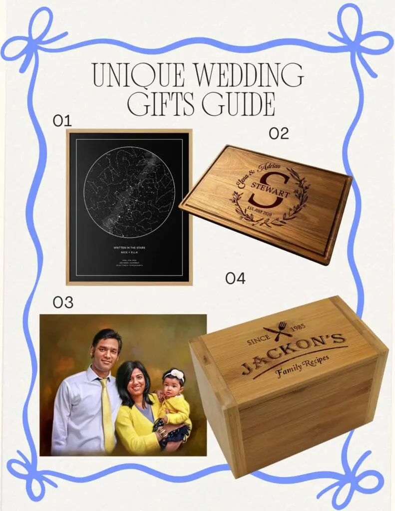 Personalized gifts create instant heirlooms that couples will treasure forever. These custom items tell their unique story and become meaningful symbols of their wedding day and early marriage.