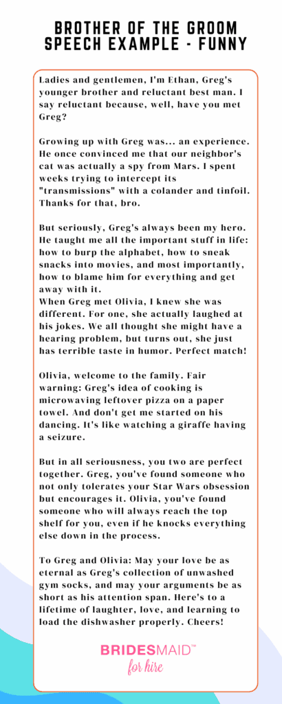 A good brother speech is like a rollercoaster – it should have ups, downs, and leave everyone feeling a little giddy at the end.