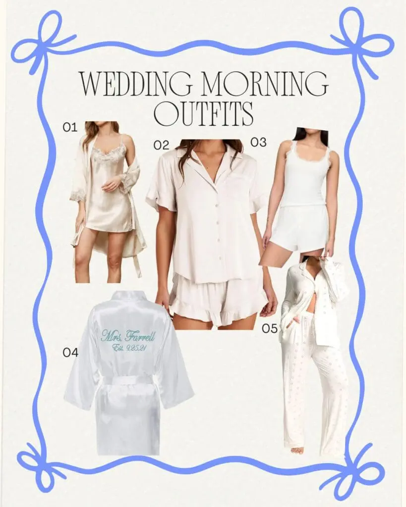 A matching satin pajama set in soft colors offers comfort and sophistication for wedding morning preparation. The coordinated pieces photograph beautifully while providing easy removal without disturbing styling.