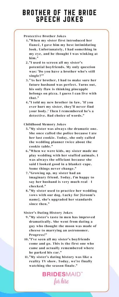 Strike a balance between humor and heart. Share stories that reveal your brother’s character growth and the positive influence of his partner. Keep jokes clean and inclusive, avoiding ex-girlfriends or embarrassing moments.