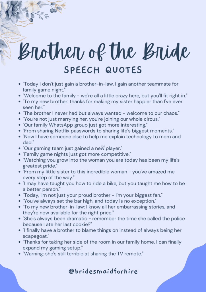 A brother’s perspective combines sibling humor with protective affection, offering unique insights into the bride’s character while welcoming her partner to the family.