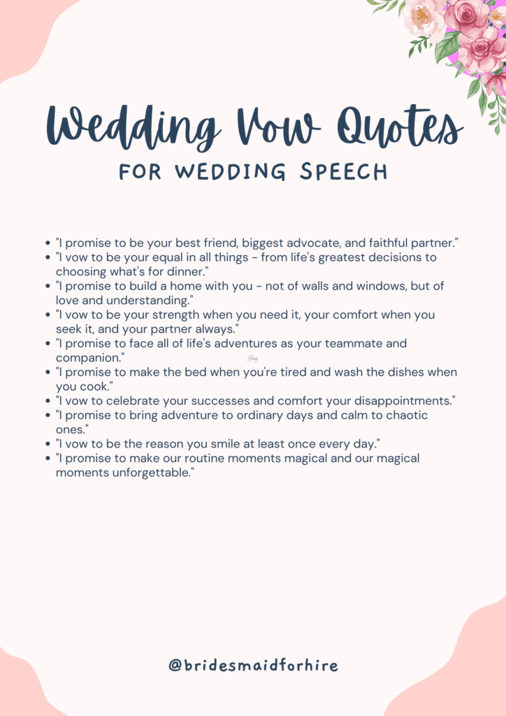 That’s where wedding vow quotes come in handy. They can spark inspiration, help you find the right words, or simply add a touch of poetry to your personal promises. In this guide, we’ll explore 100 beautiful wedding vow quotes that might just help you craft the perfect vows for your big day.